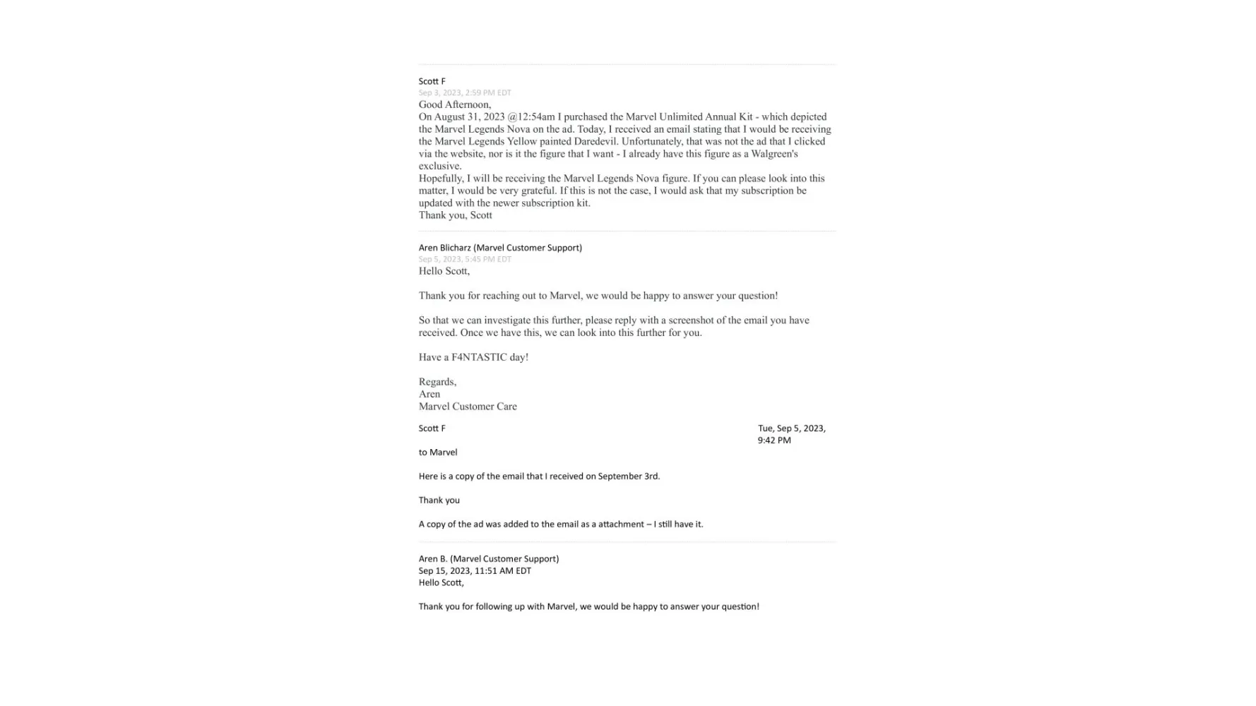 On August 31, 2023, I purchased a Marvel Unlimited Annual Kit that pictured a Marvel Legends Brown Suit Nova as the included exclusive figure. On, September 3rd, I received an email picturing the wrong kit, so, I contacted Marvel customer service. Finally, on September 15th, I was finally given an answer and that I received the wrong email and that I would receive the Nova figure.
