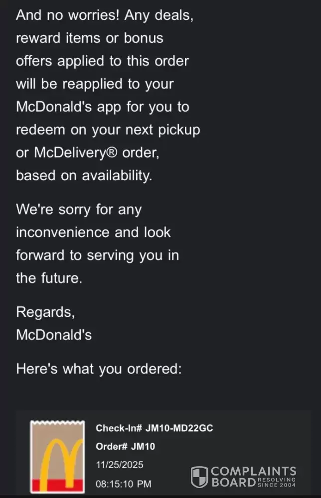 On November 25, 2025 I decided to go to my local McDonald’s and place my orders through the McDonald’s App for Pickup since it’s way more cheaper due to all the deals that McDonald’s allow you to use for pickup orders only which is better than ordering it for delivery since McDonald’s rarely have deals for delivery orders. So as I was in the process of placing the orders I keep receiving a technical error in the McDonald’s App (As Shown in the Picture) that’s not only canceling my orders and getting rid of my pickup only deal offers but Also forcing me to wait 15 minutes for every time I use a pickup only deal just for my orders to be cancelled and my pickup only deals to be erased off the McDonald’s App. (As Shown In the Picture) So As Soon my orders were cancelled, I received emails from McDonald’s claiming no worries any deal offers that was applied to these orders will be reapplied to my McDonald’s App (As Shown in the Picture) but that’s a lie because I was sitting in my local McDonald’s for over 3 hours and none of the pickup only deal offers reapplied back to my McDonald’s App. So at this point I was left with no choice but to spend a lot of money through the McDonald’s cashier instead of the App due to McDonald’s App False Advertisement then i walk out the McDonald’s while it was raining left very disappointed spending a lot of money on food that was cold, wet and not worth the price at all.