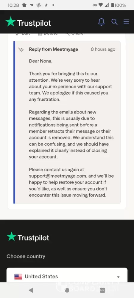 I had a guestion wrote in. Grace Sterling responded. She deleted my account without my consent. I tried to get support to fix it no luck. Reviewed on trust pilot and received a response. However the response was a lie. They can't restore your account. I definitely do not recommend this site. If they can make that big of mistake, I wonder what would happen on really big issues. This made me not trust the safety of the site. Beware it's mostly a scam