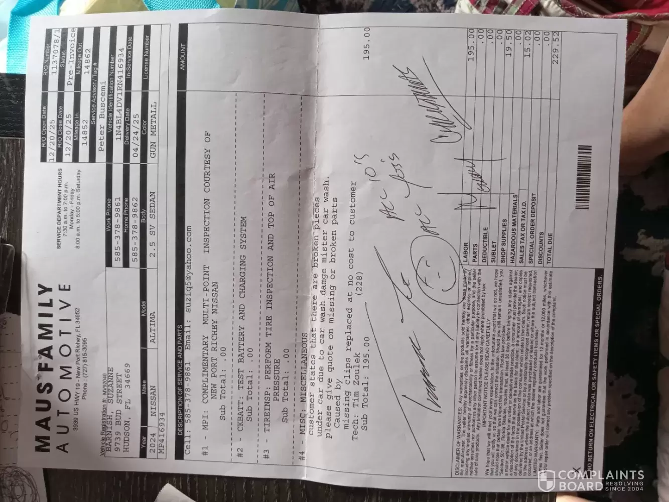 On December 13,2025, I went to Mr. Carwash at 9215 State Rt. 52 in Hudson, Florida. When I came out of car wash there was a strange noise coming from car, I immediately pulled over, there was a fan cover stuck underneath front of my car. I had to back up to get it out from under front of the vehicle. A clip from front of car was laying on top of fan cover. The employees from car wash said it must have come from a prior vehicle that went thru. I filed a complaint with Skylar, Report#FL-1221-25-044519 that same day. She contacted me on 12/16/2025, she said that there were no parts from car in car wash, and that they were not liable for damages. My husband went down to car wash after the phone call; Skylar admitted to him that it was a fan cover from the car wash. ON 12/18/2025, she contacted me again claiming that I did not have damages, I told her, I was going to dealership on Saturday 12/20/2025, as it was earliest I could get there due to work. I would have them loook at car and let us know of damages. I have a bill totaling 229.52 for having them look at the car and replacing clips on belly pan which were tore off by fan guard. ON Sunday 12/21/2025 Tiffany called me and asked if incident was resolved, I told her NO it was not, she said Skylar had credited me account with 3 months car washes and asked if I had agreed to it. I had not, did not even know anything about it.I told Tiffany that when I spoke to Skylar on Thursday that I was going to dealership. Tiffany said she would talk to her and find out why she did what she did. Tiffany said, she would get back to me, but I have not heard anything and it's been over 2 weeks ago. It does not justify faulty equipment and her covering up the issue. I'm attaching the pic of fan cover, clip from car and dealership receipt. Skylar is covering up the issue that there was faulty equipment, and they do not check car wash after vehicle washes. I usually go to the other on in town as the employees and helpful and respectful there.