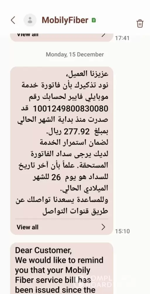 However, last week, I unexpectedly received a new bill amounting to SAR 277.92, even though: