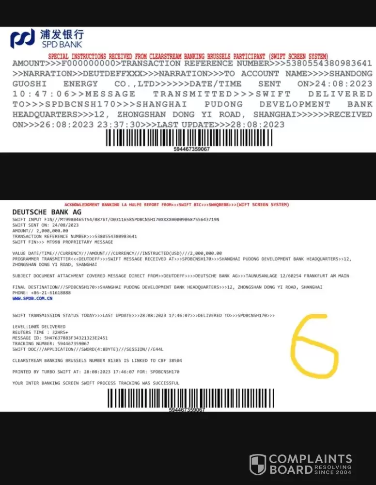 Then on 25th August, 2023, Mr. Onwudinjo sent us a copy of the purported APG SWIFT message with the name of Olivier Vigneron – Chief Risk Officer with Deutsche Bank as the one that signed the document. He, Mr. Onwudinjo asked us to get in touch with Shandong Guoshi Energy Company to reach their bank, Shanghai Pudong Development Bank, that the APG was already in the SWIFT system. He also sent us a purported SWIFT acknowledgment copy (Document marked 3.) and then on 28th August, 2023, he sent us copies of a purported acknowledgment from SPDB and a SWIFT tracer. (Document marked 6.)