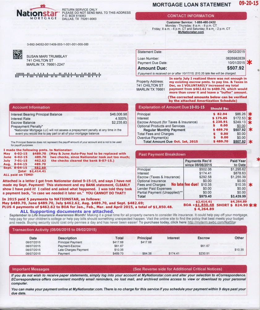 Our mortgage was moved from Ocwen (let's not even go there) to Nationstar. All started fairly well. Then about 4 months ago, the letters, emails and phone calls started about: do you need help paying your mortgage? your payment is late!
