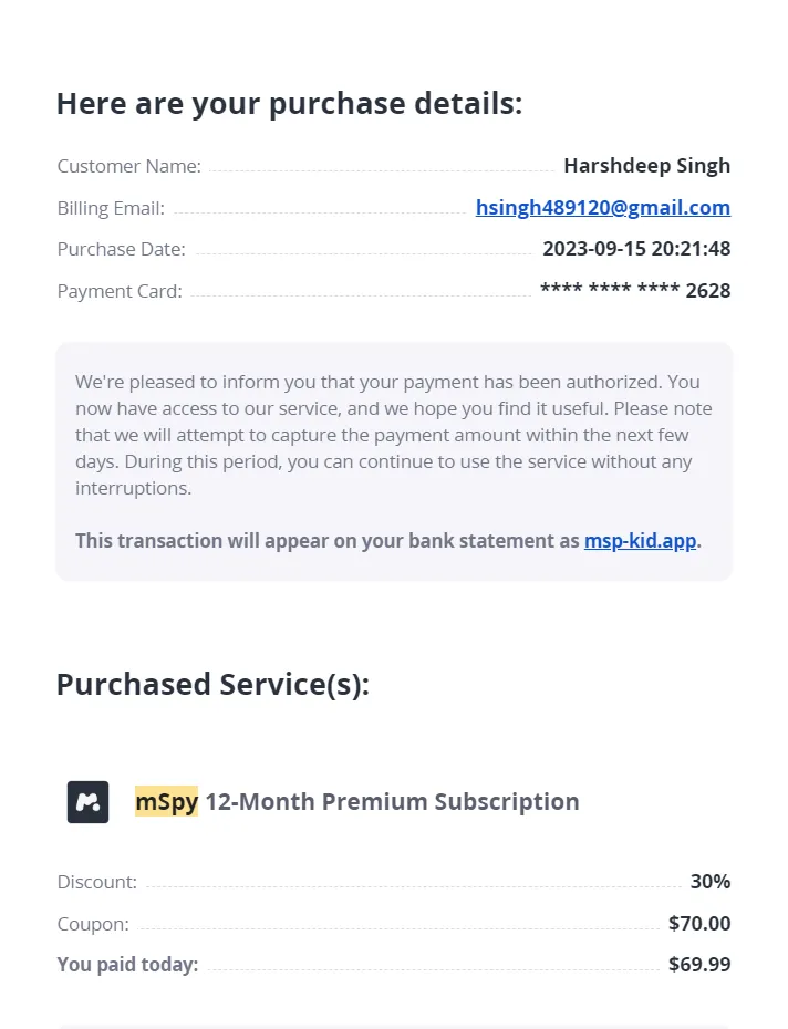 Once I was assured that this was the case as I do not have access to this device, I have mspy my credit card numbers and purchases their product.