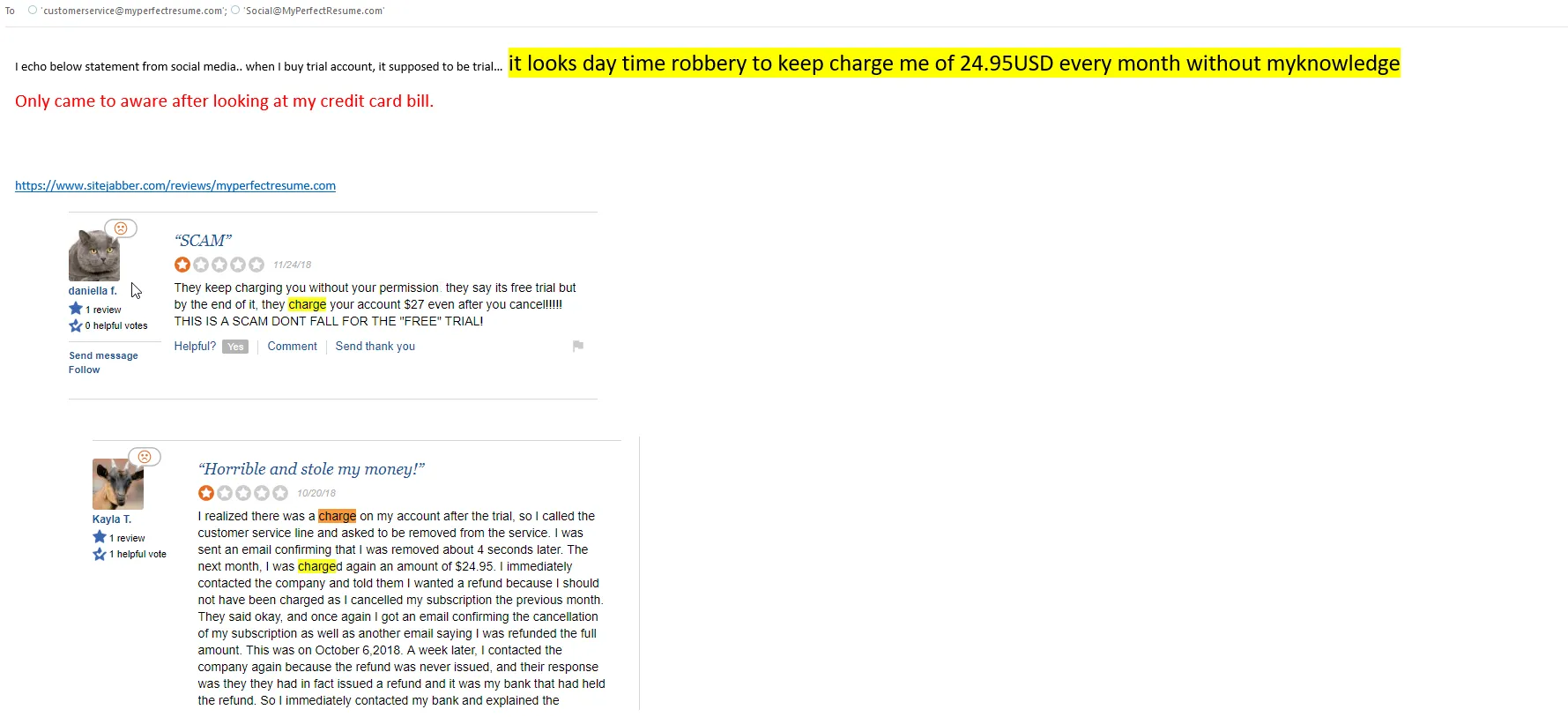 Did this happen to you, too? It happened to me (I have all the emails to prove it), and from what I've seen online I'm sure it has happened to many, many other victims. My Perfect Resume is actually The Perfect Scam and deserves the Mother of all Class-Action Suits. People, it's time to rise up and shine the light of truth on these cockroaches.