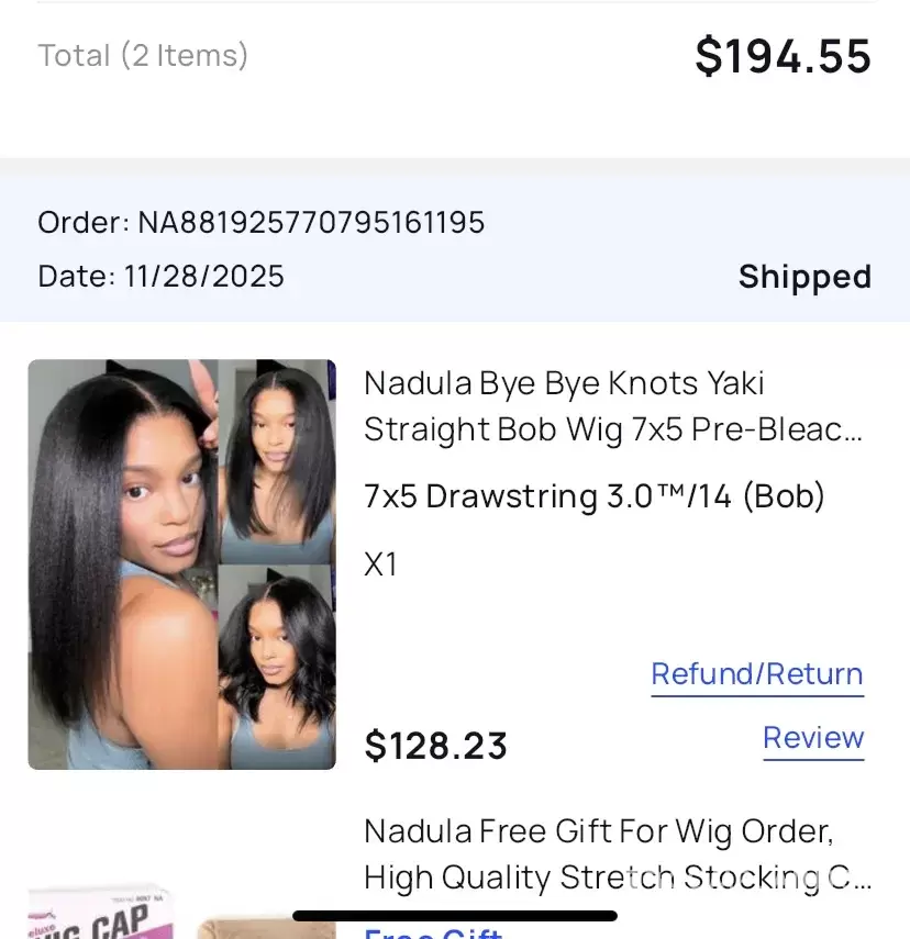 First off this company is a fraud! My first time purchasing through this company I did my research and they paid women to say these wigs and hair bundles are 100%human hair. And even reading the reviews of the wig they were getting outstanding reviews. So I decided to make my purchase on April 8th 2022 the wig arrived April 11 2022, opening the box a foul chemical smell came from the box, I pulled wig out and noticed how big the wig cap was, I knew it was not going to fit my head properly. Tried it on any way and wig was way to big the back of wig cap was by my neck area. There is no way to tighten the wig and make it fit like advertised on website. I ran my fingers through the wig, they wig she'd like crazy and the ends of the hair where already tangled. The wig looked like it was used and they sent the wig to me. This wig looks nothing like the website are what was advertised by the company. I let nadula know I needed a full refund. They stated to send the wig back. But reading the other complaints about this company not refunding people's money back is insane. I will also report this company to ftc. This company is getting away with people's hard earned money. And sending customer bogus products. This is not human hair and it's not quality work.