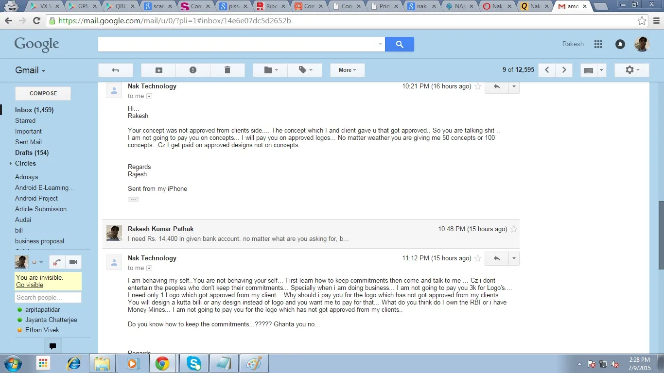 First learn how to keep commitments then come and talk to me ... Cz i dont entertain the peoples who don't keep their commitments... Specially when i am doing business... I am not going to pay you 3k for Logo's... I need only 1 Logo which got approved from my client... Why should i pay you for the logo which has not got approved from my clients... You will design a kutta billi or any design instead of logo and you want me to pay for that... What do you think do I own the RBI or i have Money Mines... I am not going to pay you for the logo which has not got approved from my clients..