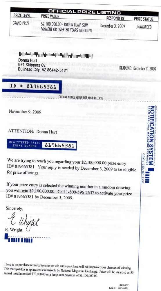 I also received a letter in March of 2009 from the "National Magazine Exchange" stating that they were trying to me regarding my $2, 100, 000.00 prize entry ID# and said I had to respond by a certain date to be "eligible" prize offerings. It also stated if my prize entry is selected in the random drawing I would win $2, 100, 000.00 but it said I needed to call [protected] to activate my ID# by this certain deadline. I did proceed to give them a call and at no time did they mention the sweepstakes. They were more interested in trying to sell me some magazines, so I eventually hung up. Also, note I spoke with a woman who said her name was "Helen" (which I doubt) but note that my letter was signed by E. Scanlou. Then it wasn't long after that my boyfriend received a letter stating the same info. but signed by a different person! One thing I can not stand is for someone to try to hurt innocent people that might just need a little help. I hope whoever is doing this that GOD will punish you to the fullest extent of the law! May God Bless and Be with all of you that have been hurt in this same situation.