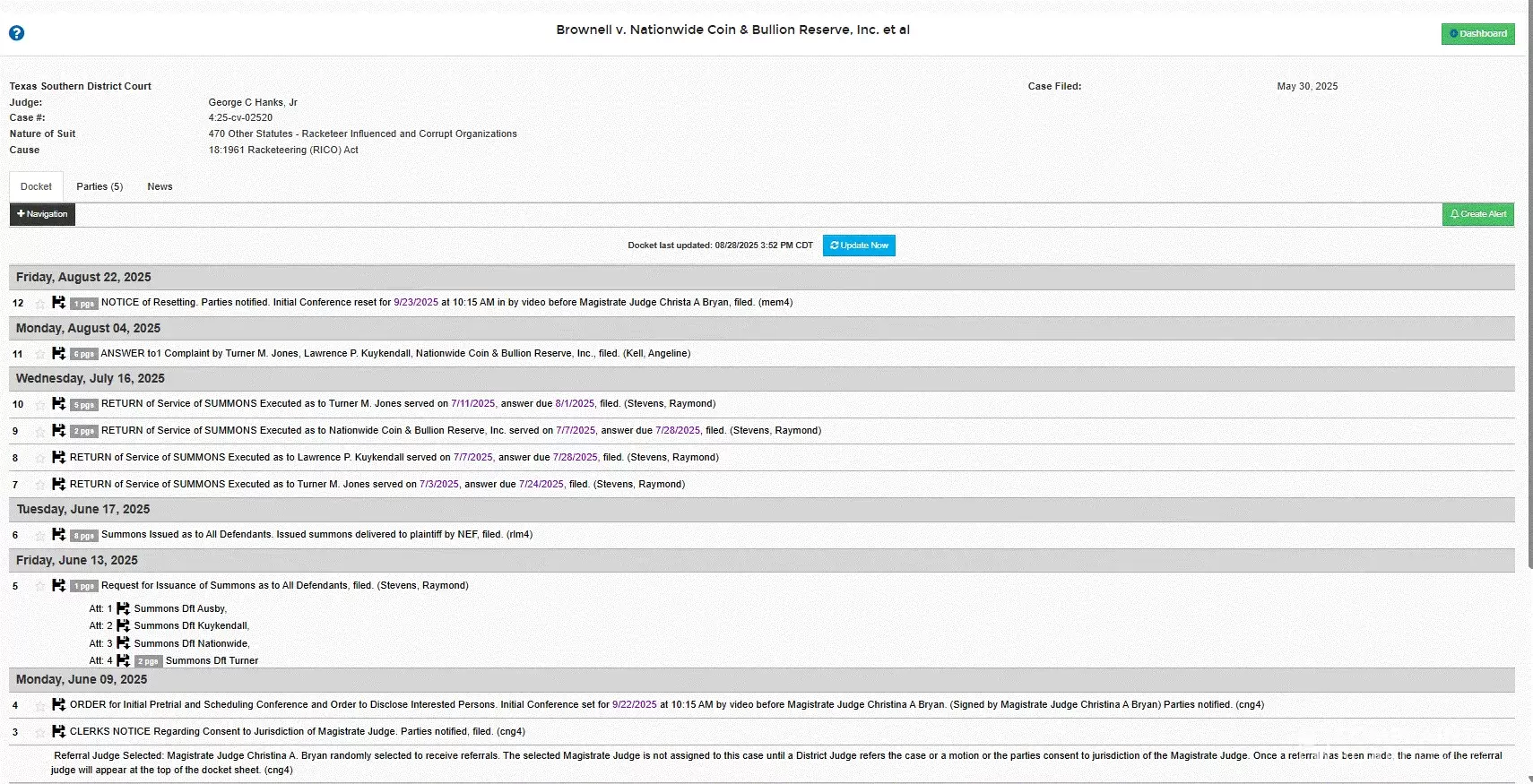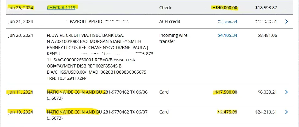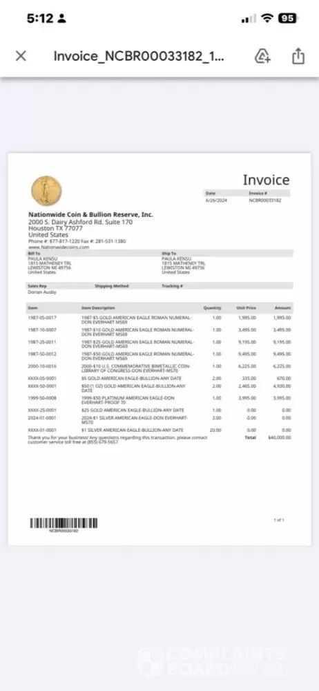 In June 2024, I paid a total of $59,975 (a $40,000 check plus $17,500 and $2,475 debit transfers), documented on invoices #NCBR00032818 and #NCBR00033182 — amounts I was later told were worth only $22,554.61 (and which market quotes show are approximately $32,725.33 today). The receipts are all attached. They are being sued in Texas Southern District...
