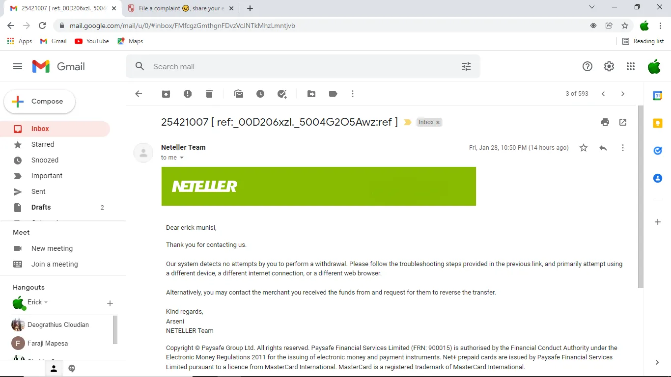 Desired outcome: une réponse positive, conforme à l'honnêteté de la société "Neteller+*Neteller.com"