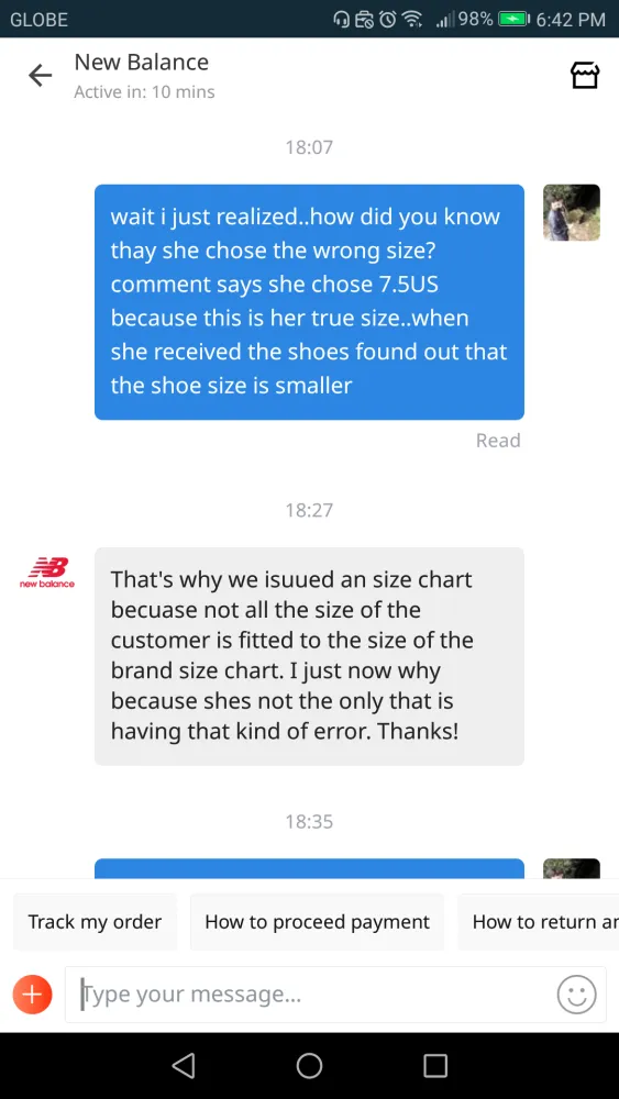 So I sent a message to inquire. A certain Josh replied that I follow their size chart and that the customer did not follow her shoe size correctly. So I asked him how did he know that she chose the wrong shoe size when in fact she did choose the right shoe size? He answered he just knows the reason why because she's not the only person who experienced the same situation. So I told him, if that's the case shouldn'yt you inform your customers to choose a size bigger than their regular size instead of assuming that customers are making the mistake.