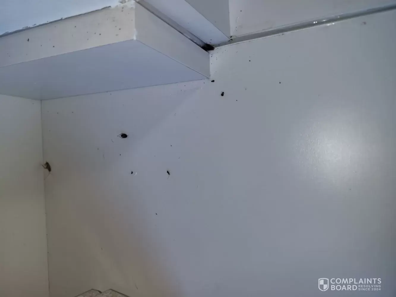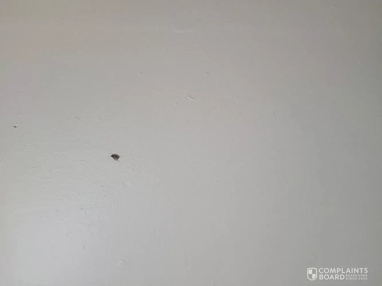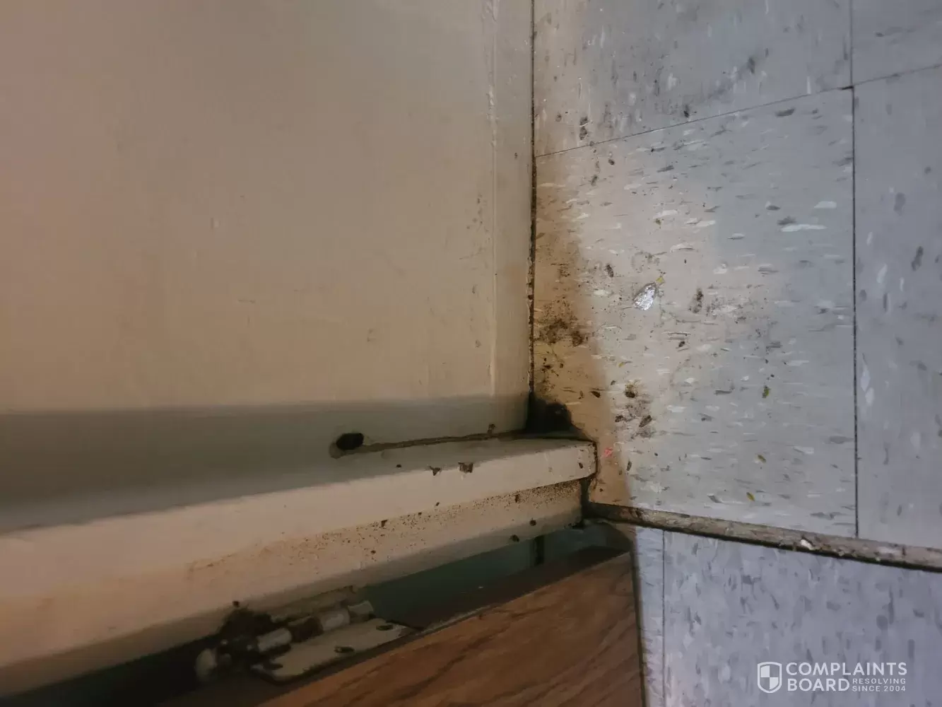 When it's rain the water that collects on roof comes into my bedroom through the walls and under the tiles. Floor tiles are cracked and has holes. Window pain has a hole, where small creatures (bugs) seep out from outside. Paint peeling and bubbling from access water build up. This has been going on for 3 years and main office knows the situation.