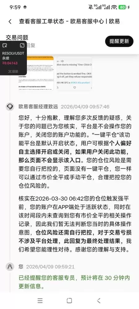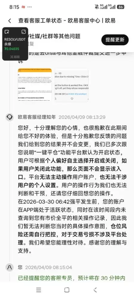 On March 30, 2026 at 6:45 PM (UTC+8), I had 50 open positions in my main account on OKX. When the market moved against my positions, I urgently needed to close them, but I discovered that the "one-click close" button was missing from my trading interface. This prevented me from closing my positions in time, resulting in forced liquidation by the platform. I incurred a loss of 15,000 USDT.