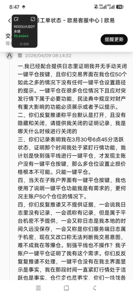 I immediately contacted OKX customer support. A specialist requested my local log files. After reviewing the logs, the specialist confirmed that the one-click close button was disabled on my interface at that time, and importantly, the logs showed NO record of me manually disabling this feature.