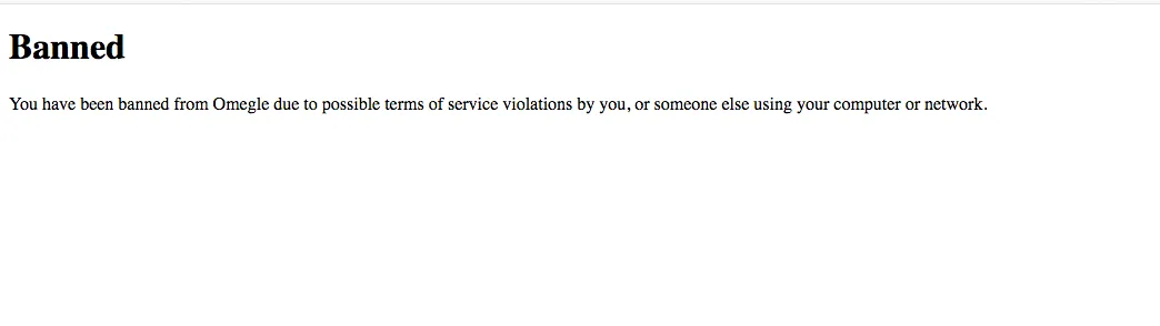My friend and I were on Omegle doing nothing wrong. We were just talking to these girls about how pretty their singing was. Then we clicked the new button. It then went to bring us to the ban page saying "you have been banned from using Omegle due to possible terms of service violations by you, or someone else using your computer or network." We did simply nothing wrong and got banned.