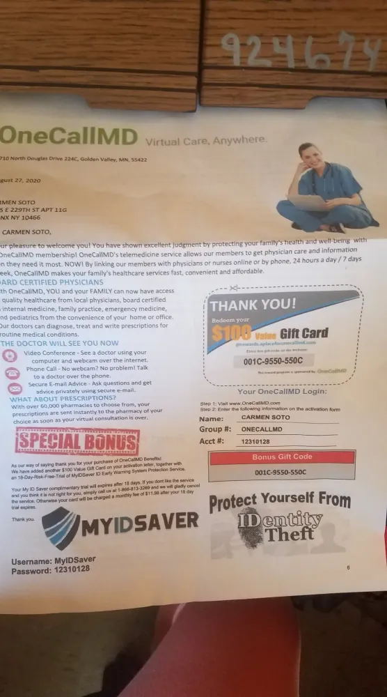 Read full complaintOnecallmd - Fake gift card and can not get in touch with anyone to cancel my services