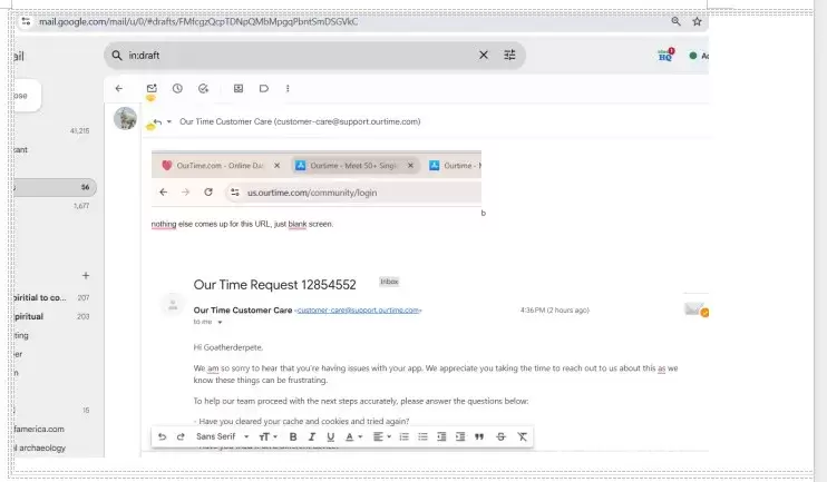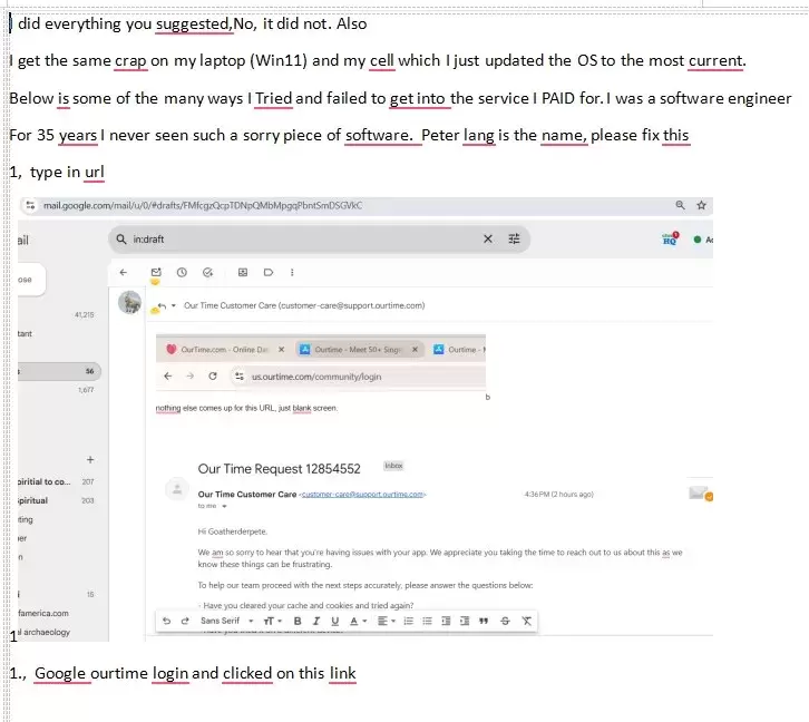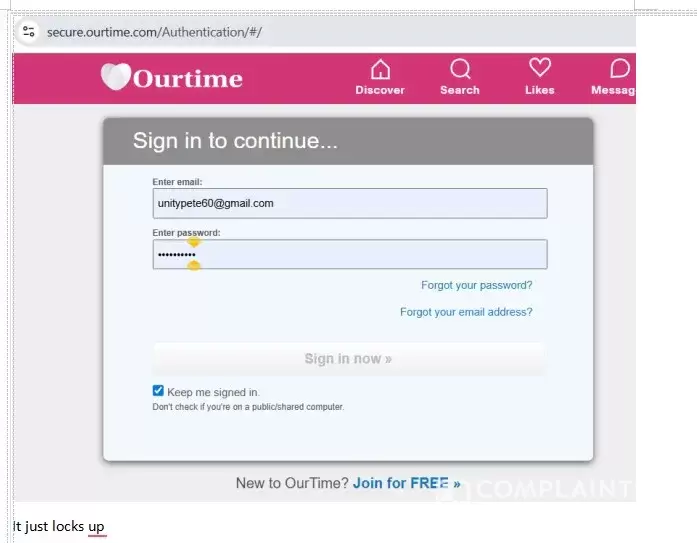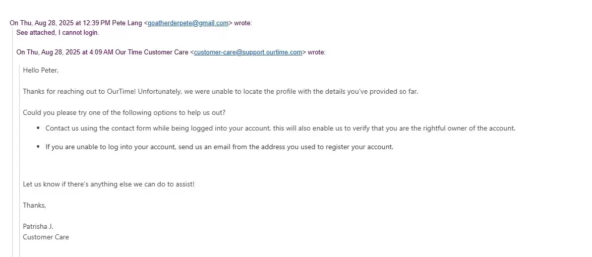 I signed up on the dating website Ourtime.com. The company charged me 22.50 on 8/19/2025. I had 3 days of glorious usage, then I could not login in with the credentials I KNEW I hade put in originally, that had worked before. I was a software engineer for 35 years and did all the standard things, change password, going in via the innumerable emails they sent. Nothing worked. Tried to get up with tech support, emailing, calling a message and leaving a message. Closest I got was an email telling me to login in and "express my concerns". since I couldn't log in, these were options not available to me.