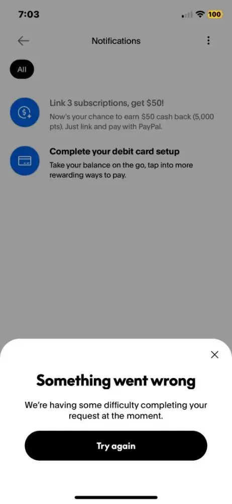 On my PayPal Account I saw a Link and Pay for 3 Subscriptions to get $50 offer. The offer doesn’t expire until September 6 (As Shown in the Picture Circled in Red) so on September 1, I decided to use the offer before it expires but unfortunately I keep receiving a error message (As Shown in the Picture) saying “we’re having some difficulty completing your request at the moment” So on September 2, I have contacted PayPal support team about this issue then the PayPal Account specialist told me that I will receive my $50 on September 9, he said all I have to do is Name the 3 Subscriptions that I want to pay for through my PayPal balance and he will take care of the rest. So I named the 3 subscriptions (The 3 Subscriptions are Netflix, Hulu and Peacock Tv) then I waited until September 10 and still didn’t receive my $50.