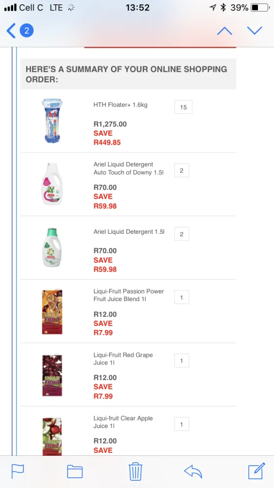 I recently placed an online shopping order ( Black Friday special around 03:30am). The online order confirmation was sent to me via email shortly after order was placed serving as confirmation of items and quantities ordered . I subsequently received the incorrect order via delivery. The quantity of item ( HTH Floater, 1.6kg) and the Ariel liquid was not supplied at all.