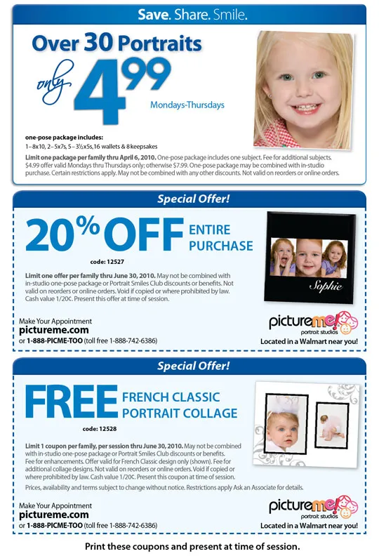 Picture Me Studio's in Walmarts are junk and a scam. There portrait packages are over priced and the make you buy there club everytime and the sad part it is good for one year. How many people have spent a extra ten dollars everytime they came in to get there photo taken? And the 4.99 deal doesn't say anything about a extra sitting fee, but they charge you five more bucks. Stay far from this company it's run just like walmarts. Buy a camera and put companies out of business like this. It sounds like. A great deal but in the long run it trash.