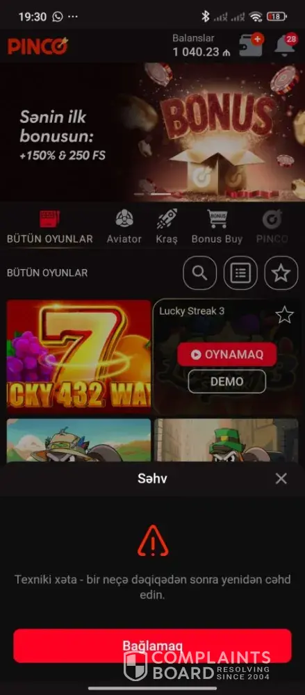 I am writing to formally complain about Pinco Casino regarding my account (ID: [protected]). I have legitimately won 1040 units through sports betting and slot games. However, the casino has confiscated my entire balance, citing a "technical error" without providing any proof or detailed explanation. I have full video recordings of my gameplay and the winning...