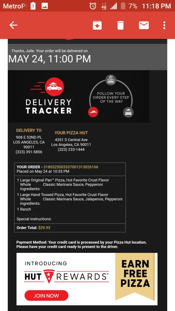On 5/20/2018. We Stopped in Osceola Arkansas. Stayed at local motel. Called Pizza Hut for pizza delivery. Person taking order was inefficient. She said she was new on the job. So I was patient. Said 45 min for delivery