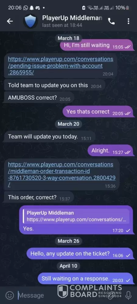I opened an urgent support ticket on the 4th of March, hoping I'd get Middleman support ASAP and get a refund but had no response. Contacted Telegram support the next day, and was told to wait. I kept updating the ticket with more info and screenshots until the 10th, where I still had no response. Sent a message to support on the 15TH! Had no response till the 18th where I was told "the team was notified to update you on this." Got a response on the 20th onsite, and told the Middleman I want the order cancelled. Even to this day...nothing.