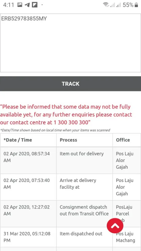 This is their tracking system 😤 everyday track still the same 😡 how can people calm down already paid and can’t received parcel so long POS LAJU no responsibility at all they don’t care how u call or complaints no answer . We had order to stay at home and work from home with this essential service provided but this really disappointed 😞