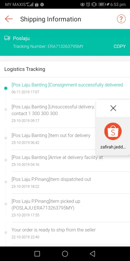 Item posted at Bayan Lepas poslaju counter on 12.45pm 11.11.2019.