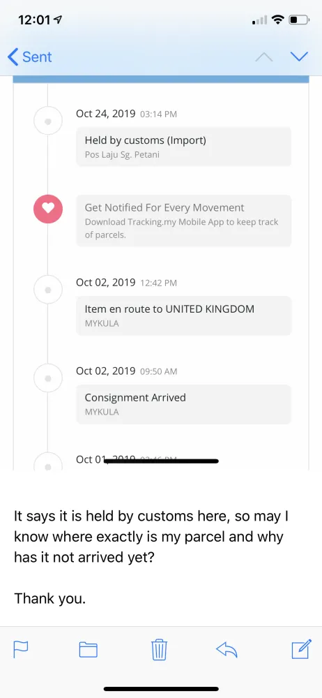 Hi, my family sent me a parcel from Sungai Petani, Kedah on 29 Sept 2019 and should arrive by now in the UK. According to track and trace, my parcel is held at customs, but when my family called HQ about it, they said the parcel has arrived in the UK and that we should contact Parcel Force UK not them, as they would not ‘tanggung' (hold responsible) for it anymore. But as I called and emailed Parcel Force, they said they have not received the parcel as it is not scanned into the system, so the parcel is still with Malaysian force. I emailed care@pos.com.my, but still no respond till today! Please do contact this number [protected] and please can you advise where is my parcel? This is my tracking number: CP310260079MY. Thank you.