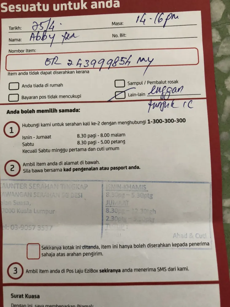 Saya terima notis pos laju pada hari ini. Saya cuba call customer line 1300 300 300 untuk membuat penyerahan kali kedua. Malangnya, masa & duit saya terbuang begitu sahaja. Seolah2 talian tu memang sekadar hiasan sahaja. Tiada operator yang menjawab & kena dengar iklan2 yang bising berjam2 lamanya. Setiap kali telefon kata tunggu 15 minit lagi. Telefon semula kena tunggu lagi. Sampai bila? Kredit dah macam air buang ke iklan yang takde kena mengena tu! Macam mana lagi saya nak mintak pihak pos laju buat penyerahan kali kedua? Ini item no saya: FQ002105701MY. Tolong la jangan nak aniaya orang.