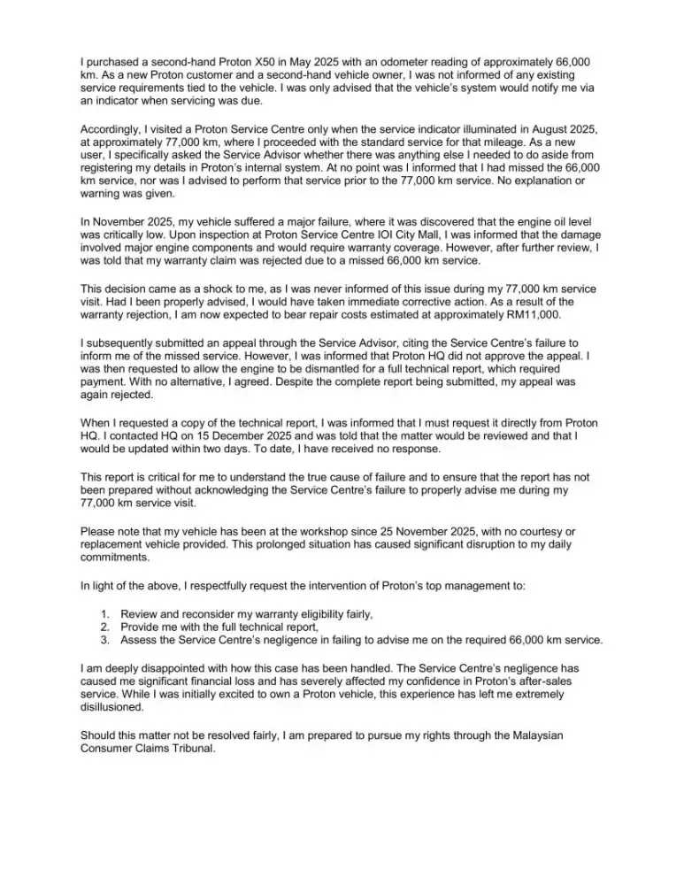 I purchased a used Proton X50 in May 2025 and was never informed of a missed 66,000 km service when I serviced the car at 77,000 km. Due to this omission by the Service Centre, my warranty claim was later rejected for major engine damage, leaving me with RM11,000 in repair costs. I am seeking a fair review, the technical report, and accountability for SC negligence.