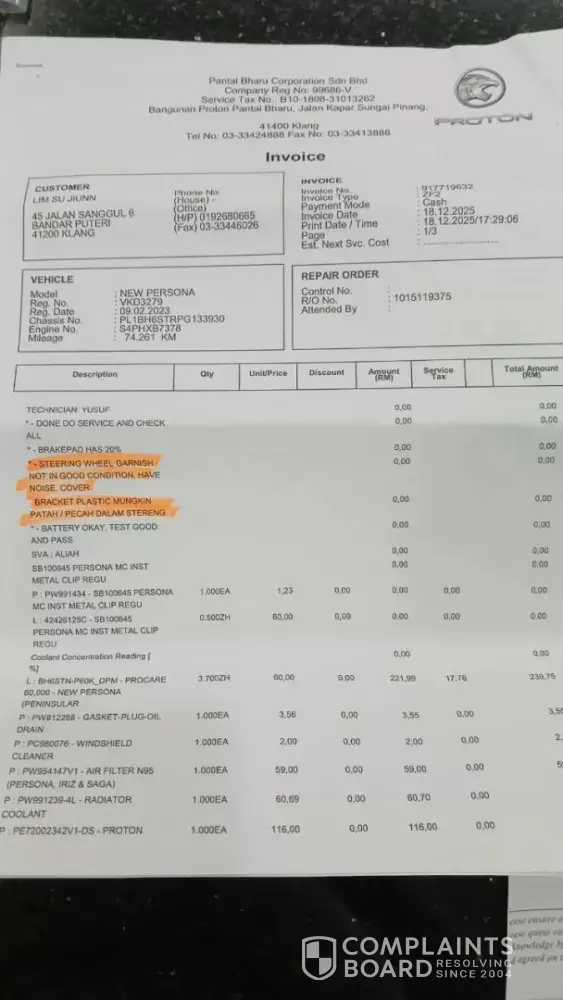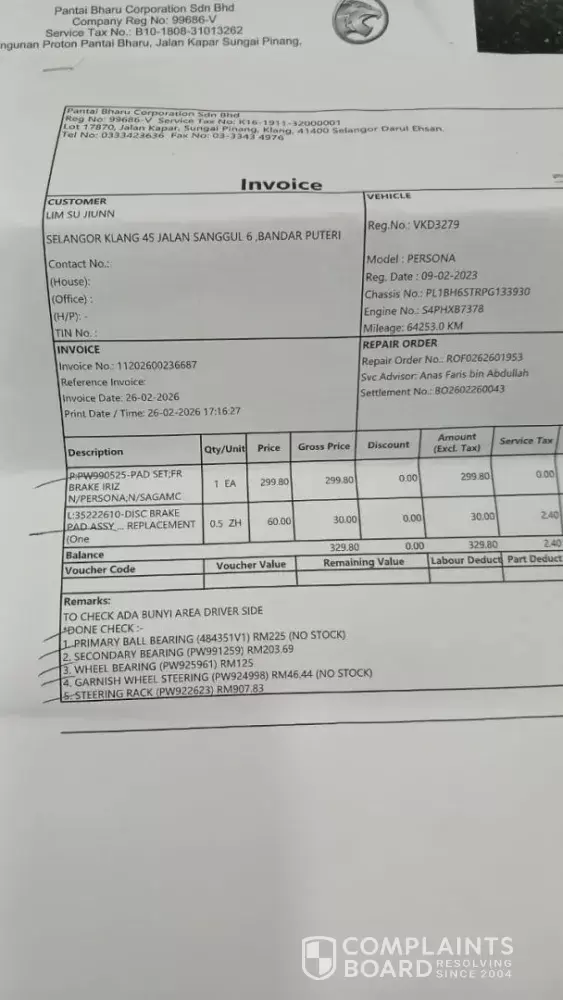 Car Plate : VKD 3279 (Proton Persona). I have sent my car to Proton service Center at Patai Bharu Corporation S/B at Kapar for 60k main maintenance on 18/12/2026 with complaint of car wheel noise from driver side. after service, they feedback that maybe the noise is from Steering Garnish and ask me to come back for repairing after two months when i need to change my brake pad. I went back to the service Center on 26/2 to get my brake pad replaced and on the noise issue. They told me that now they found the wheel noise is not only from wheel garnish but also wheel bearing. Told me to pay myself as my car warranty has expired. I ask them help to appeal this to HQ as this issue is from December since now and yet your service Center not fix back for me. it will be not fair as if i have get it done by Dec during my car still have warranty.