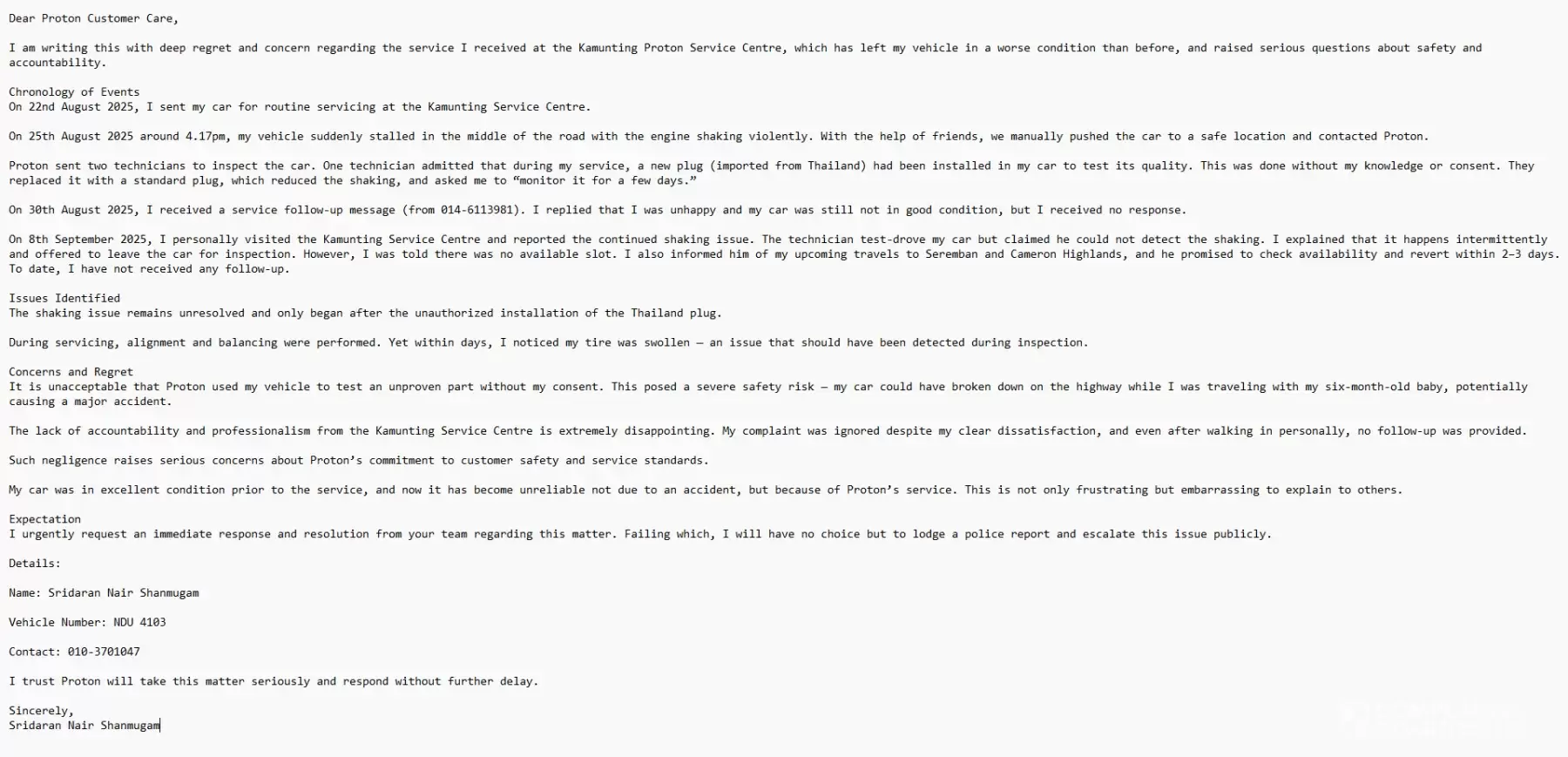On 22nd August 2025, I sent my car (Reg. No. NDU 4103) for routine servicing at the Kamunting Service Centre. Merely three days later, on 25th August 2025, the vehicle suddenly stalled in the middle of the road, with the engine shaking violently. With assistance from friends, I managed to move the car to safety and contacted Proton. Two technicians were sent, and one admitted that during my service, a new plug (imported from Thailand) had been installed in my car to test its quality. This was done without my knowledge or consent. They replaced it with a standard plug, which reduced but did not resolve the shaking, and asked me to “monitor it for a few days.”