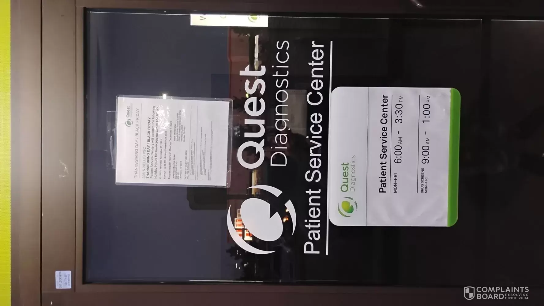 Today is 11/28/2025, I scheduled my appointment for today at 6:10am, I got up at 5:00am, went to Quest Labs down the street from where I live 5 minutes away. I arrived there at 6:00am. Lot of patients started to get out of their cars, they either were walk-ins or had an appointment like I did, they checked the doors, those were still locked, no lights were on, no signs of any employees around inside. I got down read the sign which said "Thanksgiving Day / Black Friday". Patient Service Centers will observe the following Holiday hours for Thanksgiving Day / Black Friday." CLOSED-Thursday November 27, 2025. Reopen regular hours on Monday December 1, 2025. My beef is why was the Scheduling calendar NOT CLOSED in order for a person not being able to book an appointment for the day after Thanksgiving? If they seen patients had already been scheduled for today's appts, why did they not bother to call and at least leave a voicemail for us not to attend our appointments? yes, there was a sign on your front entrance door, a lot of people don't read signs or simply do not understand them. It just common courtesy to inform patients your office will be closed. Don't just leave them hanging or ruin their sleep to get up early and go to the office for an appointment that will not happen! This is bad management practices and should be handled differently. I sure hope your Corporate office reads this review and act accordingly. If they don't then there are just as bad as your local offices.