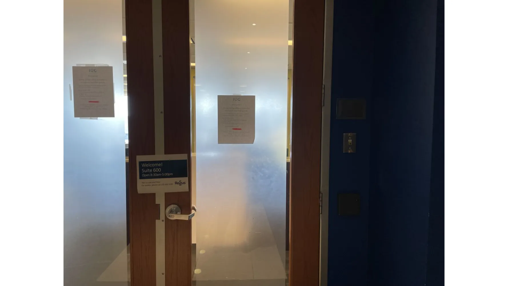 The door notices all say, " If you're visiting an occupant, please contact your host directly for access"--that literally means Regus is directing visitors to call the tenant directly for access and that Regus has ceased to provide reception services and the published advertised service of reception staff to meet and greet visitors.