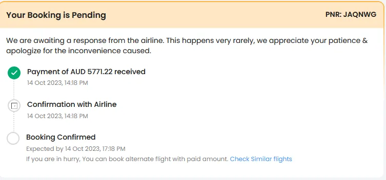 My money was taken and an email stating that it will take no longer then 30 min to book my flight due to the airline not confirming as of yet for booking id 5643.