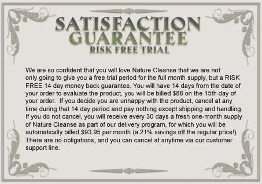 I ordered a trial of Nature Cleanse and tried to cancel the product prior to having the automatic order shipped but could not get anyone to answer the the phone number. The three options on the phone were: press one if you are in your trial period; press 2 if your trial period has passed; press 3 if you wish to order additional supplies. I held for over 30 minutes on #1 and well over an hour on #2 and did not call #3. No one ever picked up the phone; in fact, it sounded like someone continually pressed the hold button to keep the music going. I don't want the product but was charged over $88 for something I could not cancel. Since the websites do not offer any way to cancel the product I must now cancel my credit card since I refuse to pay for this product in the future. These people deserve to be shut down by the better business bureau. All I can say is stay away from this scam.