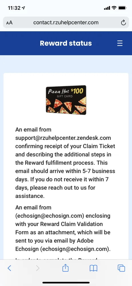 I have not received a confirmation email to sign for my 100$ Pizza Hut gift card and 2500 Pokémon coins. I have done all the requirements it asked for and received at least 3 notifications saying I will get a email from support@rzuhelpcenter.zendesk. It has been a month now and still nothing to sign for my rewards. I just received a text saying last day to receive my rewards but no confirmation email to get my rewards please help me get my rewards