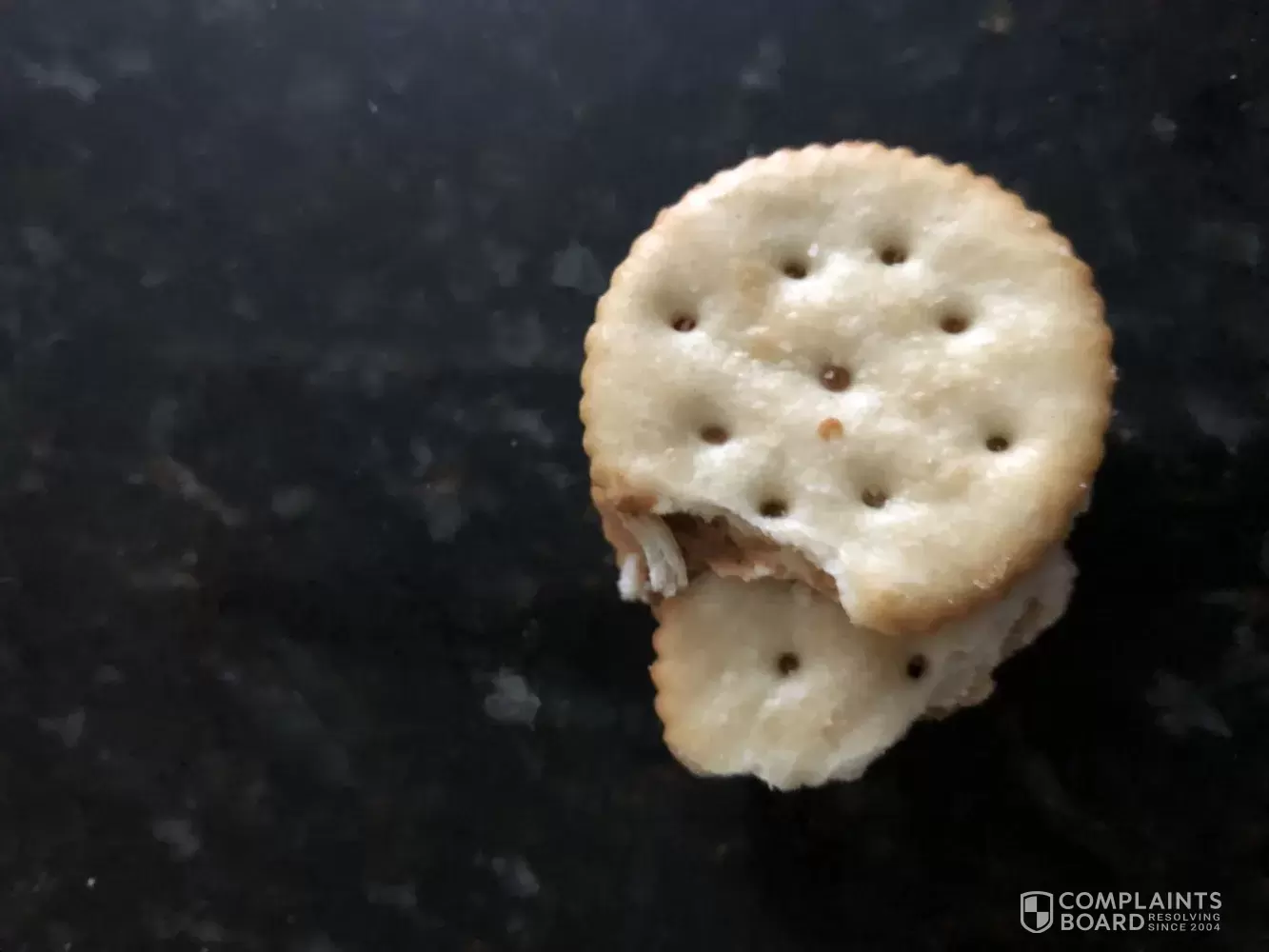 My wife bought her favorite crackers - salt and vinegar Ritz Crisp & Thins and bit into a hard unbaked cracker which hurt her tooth.