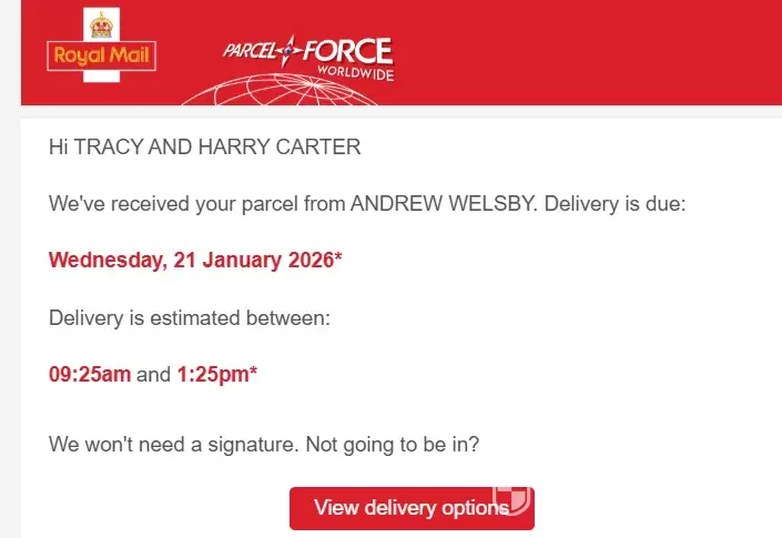 Now won't be delivered till 29 as offices closed till then