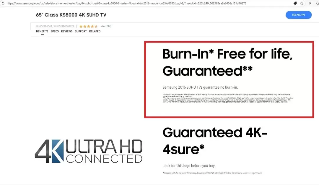 I purchased a Samsung UN65KS8000 TV which was marketed with a “Burn-In Guarantee for Life.” The unit has developed clear, permanent image retention consistent with burn-in, making it unusable. I provided Samsung with detailed photos and documentation including a BestBuy receipt confirming the issue and referencing their product guarantee. Despite this, Samsung’s Product Support Team concluded based solely on images and without a physical inspection that the issue was “not related to burn-in.” They informed me that I must pay out of pocket for a panel replacement, which I believe directly contradicts their advertised lifetime burn-in coverage. I have spent several weeks corresponding with Samsung’s Extra Care representative, Bernice Huskey, to resolve this matter. Samsung has declined to honor the guarantee or provide any accommodation, despite clear evidence of burn-in and their own promotional claims.