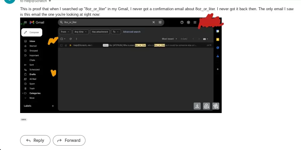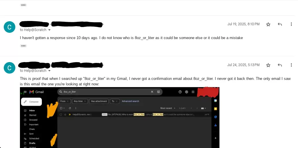 Me (Jul 24, 2025 at 5:13 PM (PST)): This is proof that when I searched up "8oz_or_liter" in my Gmail, I never got a confirmation email about 8oz_or_liter. I never got it back then. The only email I saw is this email the one you're looking at right now: [Screenshot]