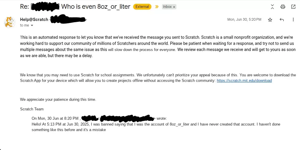 Scratch (automatic response) (June 30, 2025 at 5:20 PM (PST)): This is an automated response to let you know that we've received the message you sent to Scratch. Scratch is a small nonprofit organization, and we're working hard to support our community of millions of Scratchers around the world. Please be patient when waiting for a response, and try not to send us multiple messages about the same issue as this will slow down the process for everyone. We review each message we receive and will get to yours as soon as we are able, but there may be a delay. We know that you may need to use Scratch for school assignments. We unfortunately can't prioritize your appeal because of this. You are welcome to download the Scratch App for your device which will allow you to create projects offline without accessing the Scratch community: https://scratch.mit.edu/download