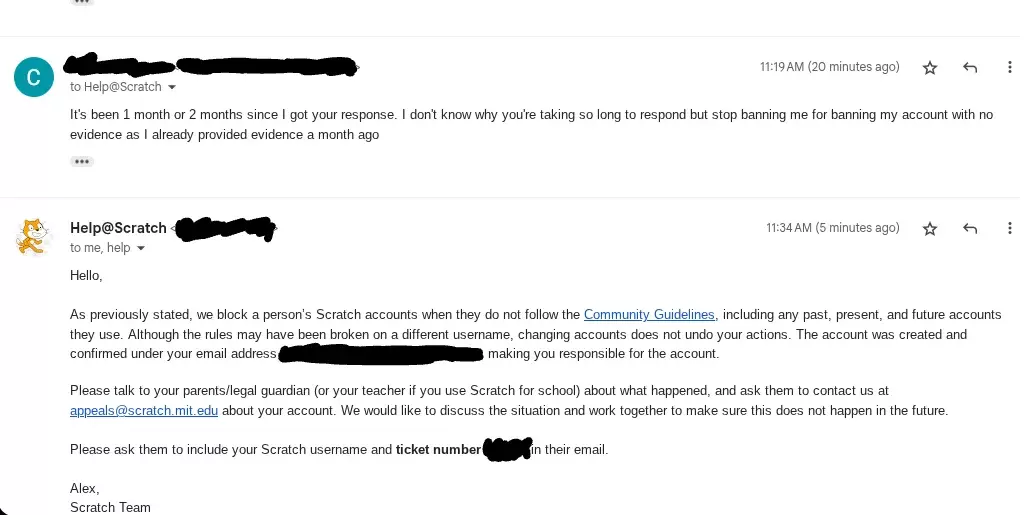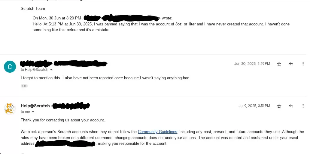 As previously stated, we block a person’s Scratch accounts when they do not follow the Community Guidelines, including any past, present, and future accounts they use. Although the rules may have been broken on a different username, changing accounts does not undo your actions. The account was created and confirmed under your email address [email address], making you responsible for the account.