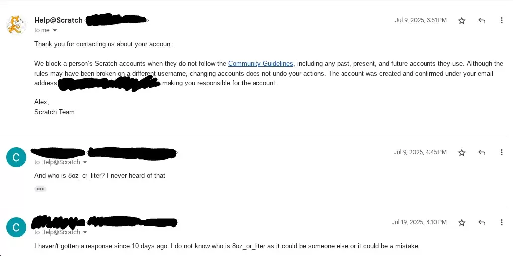 Scratch (I don't know how it took 1 week for them to respond) (note that the term "[email address]" is a edited version of my email address and it's not a actual email address) (Jul 9, 2025 at 3:51 PM (PST)): Thank you for contacting us about your account.
