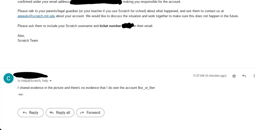 Please ask them to include your Scratch username and ticket number [ticket number] in their email.
