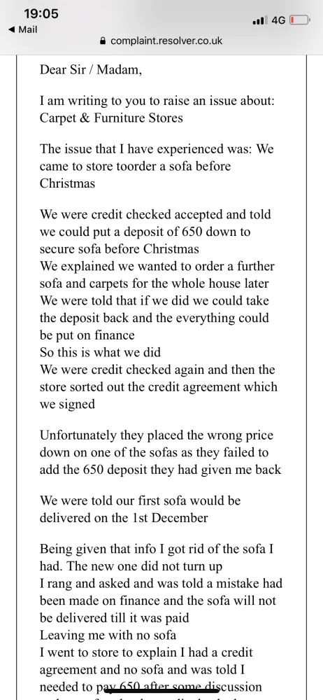 I purchased a sofa £3300! Paid in full Then also purchased my carpet and underlay £1000 I was told to pay £200 then pay the rest after the measure. had an issue with my card when tried to make payment went to bank and sorted this then called on the Tuesday to make payment Sean the sales man I was dealing with was off