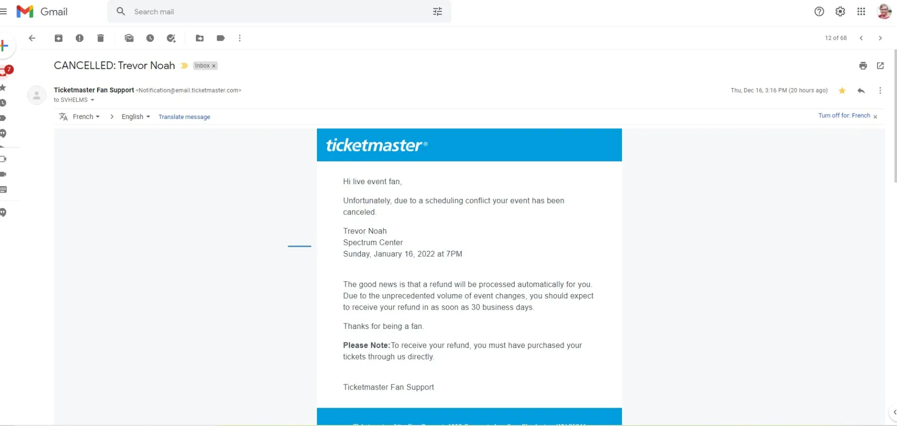 Ticket Refund for Trevor Noah Appearance at Spectrum Center 1/16/2022