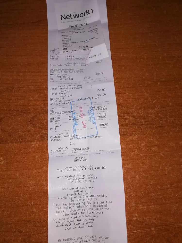 I have made an advance payment and purchased an Phillips beard shaver from sharaf dg dalma mall Abu Dhabi on 6th Sept 2019 at 3:58pm.